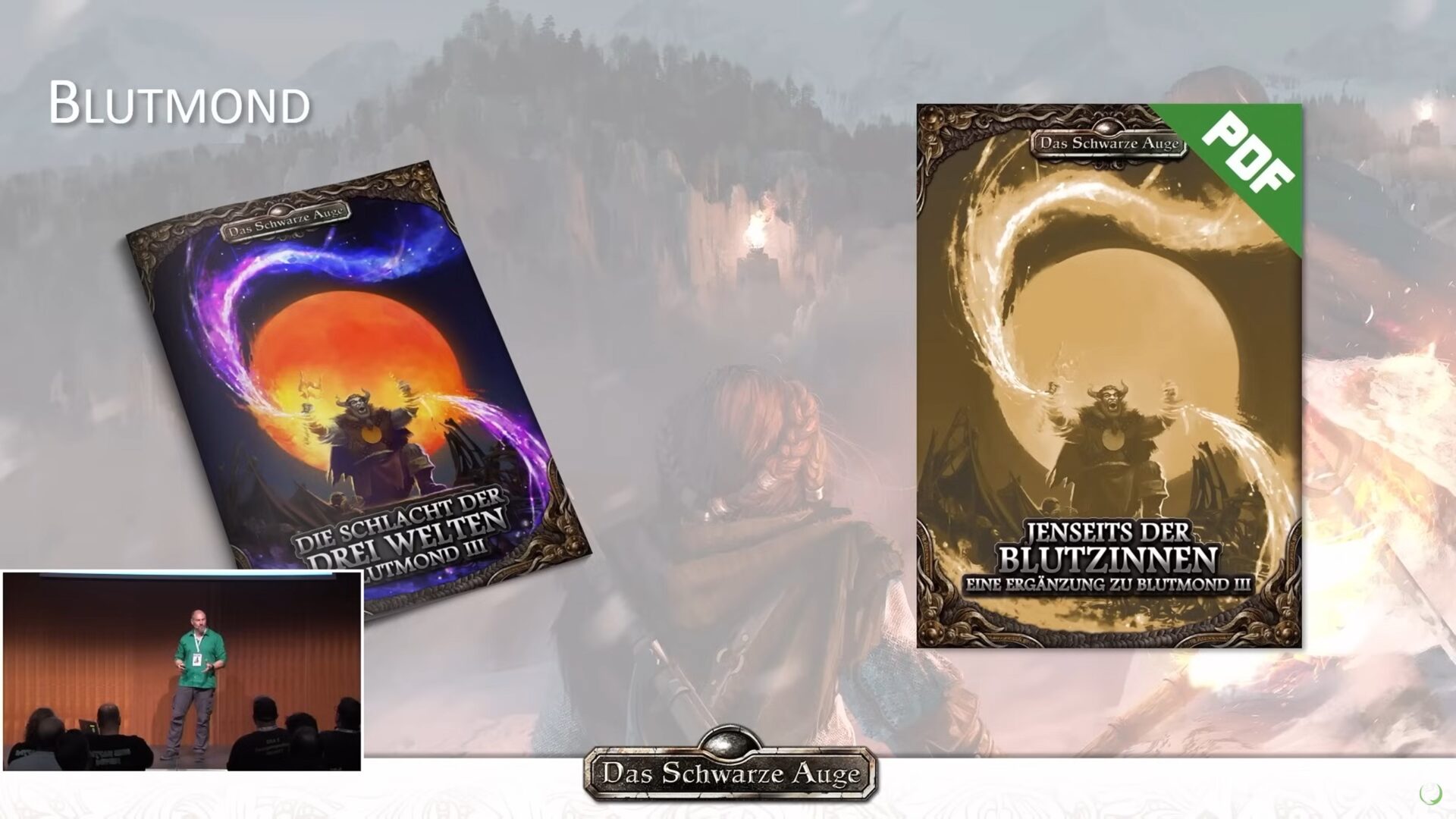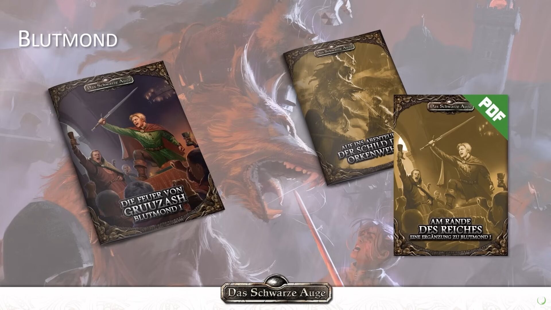 ![]() [Ulisses (RatCon 2025 - WIP)] | Jenseits der Blutzinnen (Eine Ergänzung zu Blutmond III; PDF) | DSA5 / Abenteuer (Kampagne) [ ![]() | Erst 2026 | grob | 25.06.2026 | CC 04/2026 | unbekannt (unbekannt) | unbekannt | Ulisses Spiele | Ulisses (YouTube: Das große META-PLOT PANEL - Das Schwarze Auge | LIVE | RatCon 2025 - TAG 3) / Ulisses (YouTube: DAS SCHWARZE AUGE Vorschau | LIVE | RatCon 2025 - TAG 3) | 25.09.2025 | Neueintrag | Blutmond-Kampagne aka Ork-Kampagne - "Schwester-Kampagne zu Kaiserstern" | |