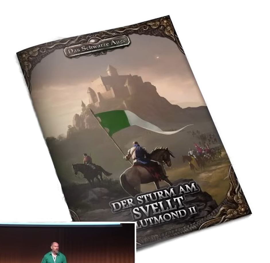 ![]() [Ulisses (RatCon 2025 - WIP)] | Blutmond II - Der Sturm am Svellt | DSA5 / Abenteuer (Kampagne) [ ![]() | Startet mit AiA in 2025 (war: "Im Laufe der Zukunft" bzw. "Erst nach Finsterwacht, Zwergenkampagne und Echsenkampagne" bzw. "Noch keine weiteren Neuigkeiten, in Arbeit") | grob | 26.03.2026 | CC 12/2025 | 39,95 € (23,99 €) | HC, A4, 128 Seiten | Ulisses Spiele | Ulisses (YouTube: Das große META-PLOT PANEL - Das Schwarze Auge | LIVE | RatCon 2025 - TAG 3) / Ulisses (YouTube: DAS SCHWARZE AUGE Vorschau | LIVE | RatCon 2025 - TAG 3) / Ulisses-Discord (Niko auf der RPV 2025) / Der nerdige & niveauvolle Trashtalk (Folge 64: Das Schwarze Auge: Verlag vs. Community vs. Redaktion - Nikolai Hoch im Gespräch) / Lurch und Lama (YouTube: Dreieich Con 2024 - DSA Verlags-Panel) / Ulisses (Twitch: Redax Insight 11/2023) / Ulisses (YouTube: RatCon 2023 - DSA-Verlagsvorschau) / Ulisses (YouTube: Feedback-Stream zur Roadmap) / Von der CCC | 25.09.2025 | Quellen (RatCon: DSA-Vorschau, RatCon: Keynote, Infos von der RPV 2025, Der nerdige & niveauvolle Trashtalk, Dreieich Con 2024), Name (war: Ork-Kampagne) | Blutmond-Kampagne aka Ork-Kampagne - "Schwester-Kampagne zu Kaiserstern"; Kampagne auf Seiten der Weidener & Greifenfurter - "Die Orks werden die Kriegstrommeln erklingen lassen"; Inhaltlich greift die Kampagne offene Handlungsstränge auf, die Bernhard Hennen beim 3. Orkensturm gelegt hat. Es wird um den Aikar gehen (was jetzt ja nicht das riesen Geheimnis ist) und eventuell auch mit den Artefakten zu tun haben, die er mit der Zeit angesammelt hat | |