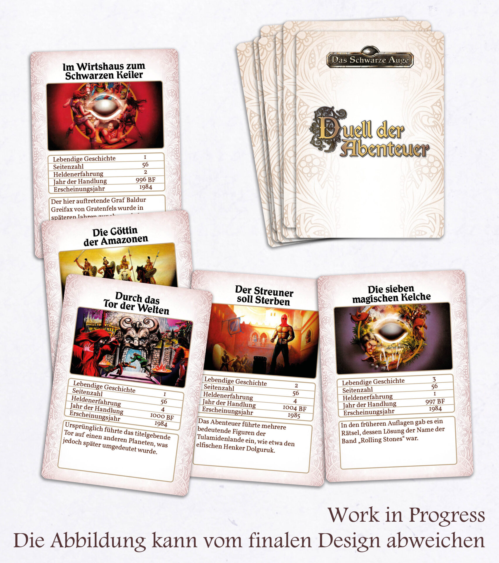 ![]() [Ulisses (F-Shop)] | Duell der Abenteuer (DSA1-Edition) | Allgemein / Brettspiele [ ![]() | 01/2026 (war: 12/2025) | fix | 29.01.2026 | CC 09/2025 | 9,95 € (-) | F-Shop / | 32 Karten | Ulisses Spiele [US26303] | Ulisses (Collector's Club) / Ulisses (YouTube: Ulisses Spiele Keynote - mit Markus | LIVE | RatCon 2025 - TAG 2) / Ulisses-Blog | 30.09.2025 | Termin (war: 12/2025), Vorbestellen, Quellen (RatCon: Keynote), Name (war: DSA-Quartett voller Retro-Charm) | Non-Feedback-Produkt mit PDF; Stich-Spiel; alle 5 Sets lassen sich miteinander mischen; war wohl "DSA-Quartett voller Retro-Charm" |